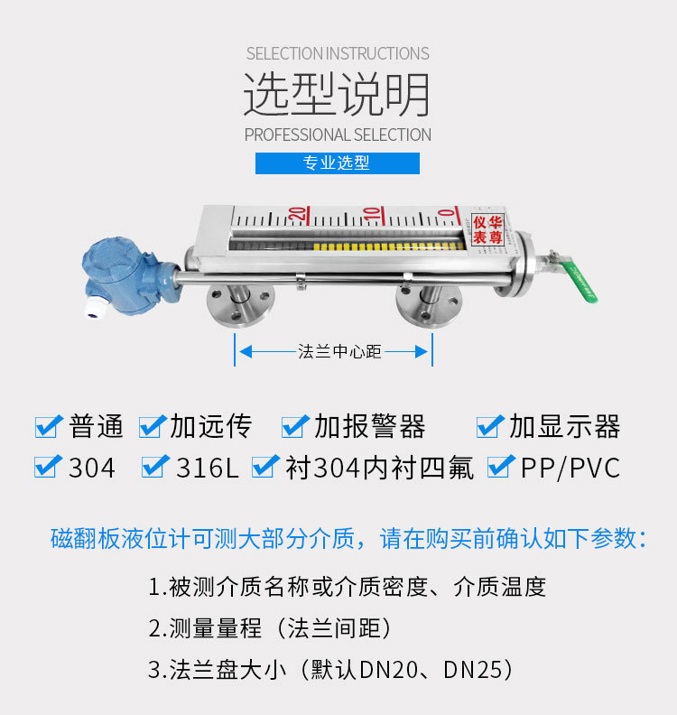 磁翻板液位計(jì)是我公司研發(fā)人員對國外液位計(jì)深入研究開發(fā)的先進(jìn)產(chǎn)品。作為物位儀表的專業(yè)生產(chǎn)廠商,我公司努力提高液位測量技術(shù),相對于傳統(tǒng)的液位測量方式,該產(chǎn)品按原化學(xué)工業(yè)部頒布的磁性液位計(jì)標(biāo)準(zhǔn)研制生產(chǎn),具有可靠的安全性,它彌補(bǔ)了玻璃板(管)液位計(jì)指示不清晰,易破碎的不足,不受高、低溫度劇變的影響,不需多組液位計(jì)的組合。具有防爆,防腐,耐高壓,耐高溫等特點(diǎn)。它比傳統(tǒng)的玻璃管,板式液位計(jì)具有更高的可靠性、安全性、先進(jìn)性、實(shí)用性。