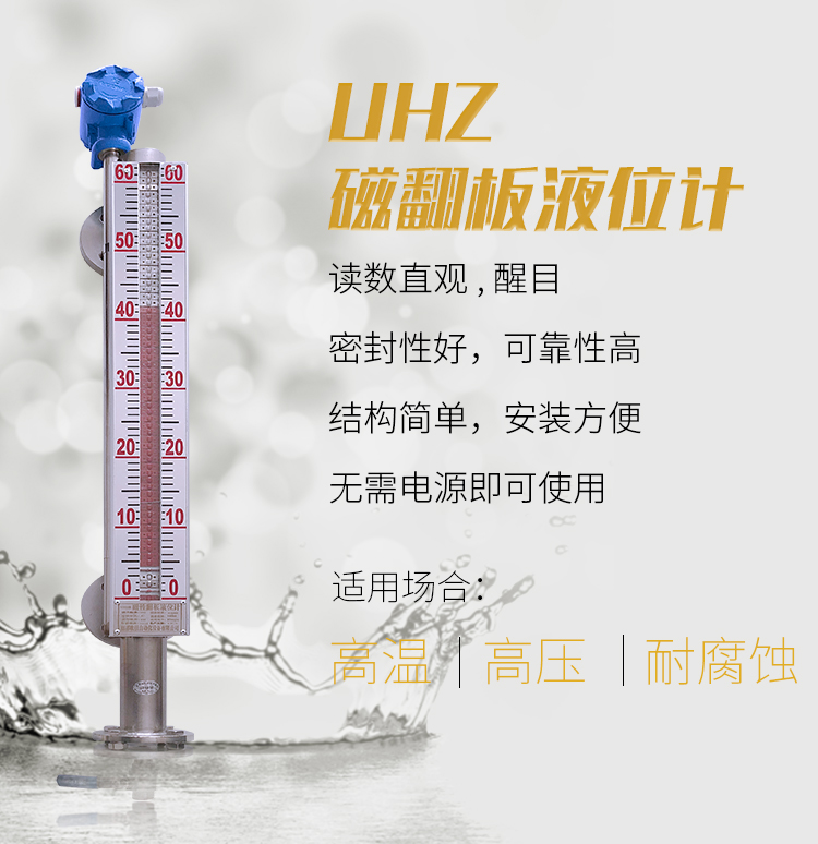 UHZ磁翻板液位計是具有可靠的安全性的檢測儀表,由于具有磁性藕合的隔離密閉結構。尤其適用于易燃、易爆和腐蝕有毒液體的液位檢測。從而使原復雜環(huán)境的液位檢測手段變得簡單和可靠和可靠安全。