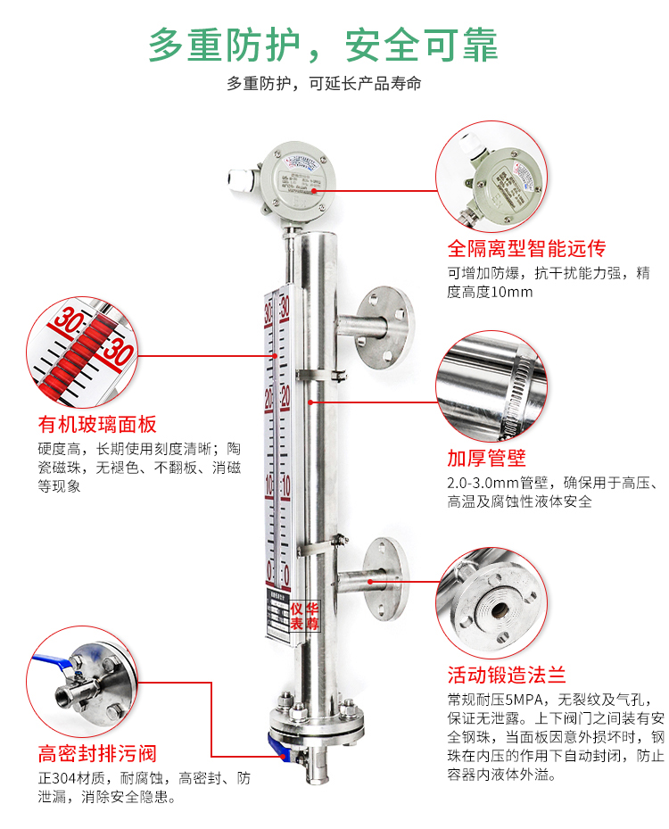 3、 被測(cè)介質(zhì)與指示構(gòu)結(jié)完全隔離,密封性能好,防泄漏、適應(yīng)高壓、高溫、腐蝕條件下的液位測(cè)量,可靠性高。