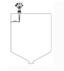 垂直安裝時(shí),為了避免圓柱容器中介質(zhì)堆角和容器壁自身電抗造成的測(cè)量誤差,建議安裝在距離容器壁大于500mm處(見圖)。