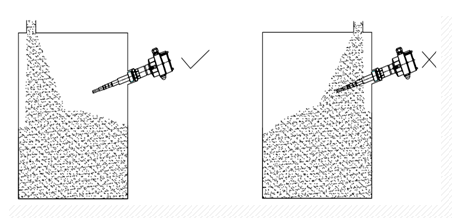 在選擇射頻導(dǎo)納料位開關(guān)安裝位置時(shí),應(yīng)避免由于安裝在入料口位置而造成的測(cè)量誤差,甚至損壞儀表(見圖)