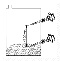 當(dāng)由于測(cè)量需要,料倉(cāng)內(nèi)要求安裝多臺(tái)儀表時(shí),應(yīng)保證儀表之間的安裝間距大于500mm,防止儀表之間的探頭相互干擾,導(dǎo)致測(cè)量不可靠(見圖)。