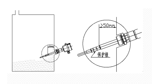為保證儀表抗粘附的功能,儀表安裝時(shí)應(yīng)保證探頭保護(hù)極插入料倉(cāng)內(nèi)的尺寸大于50mm(見圖)